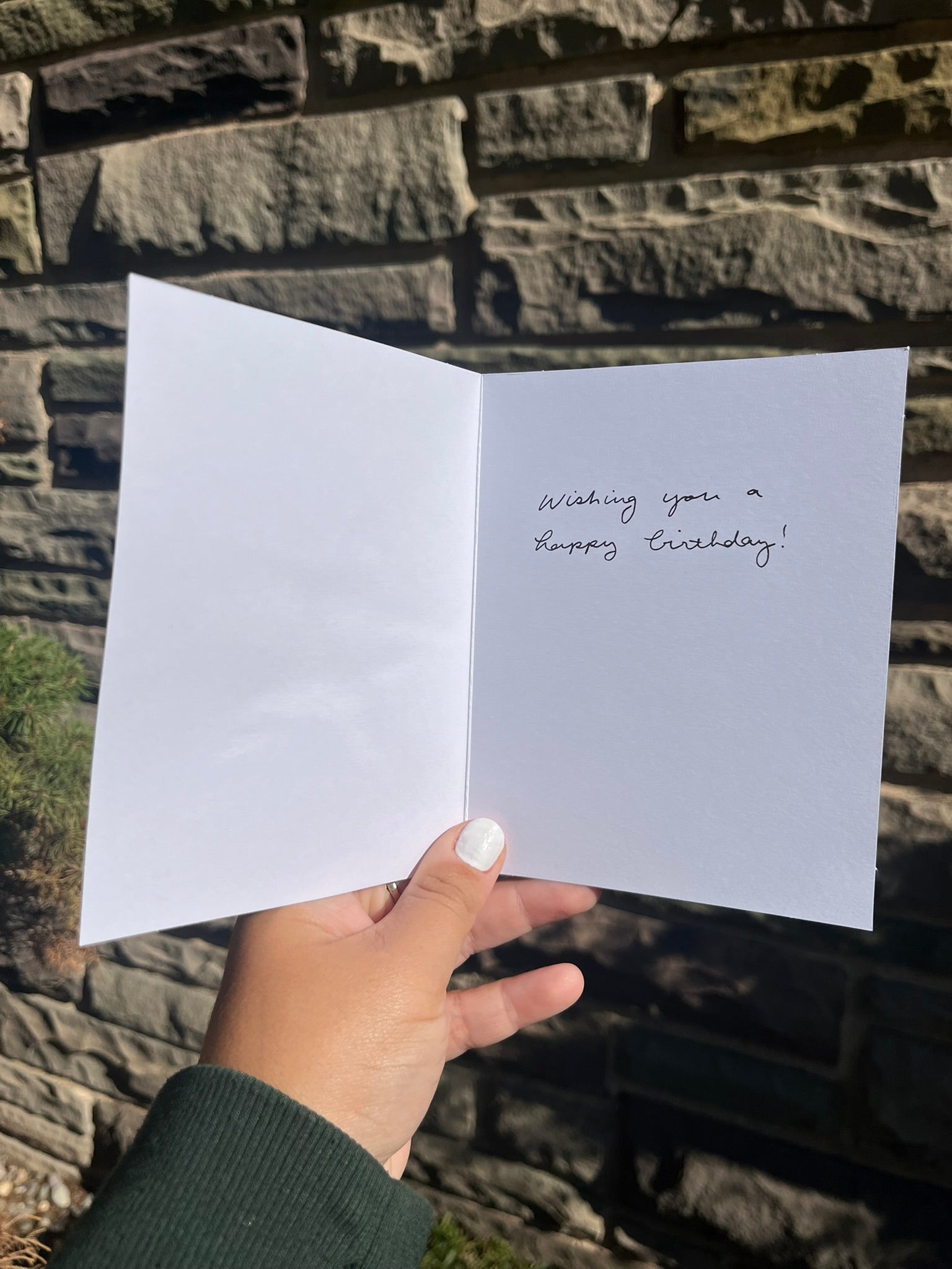 "Wishing you a happy birthday!" inside card and coordinating envelope, able to be sent via USPS with one stamp.